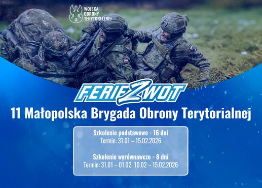 zobacz więcej11 Małopolska Brygada Obrony Terytorialnej zaprasza ochotników do udziału w projekcie „Ferie z WOT” – edycji szkolenia wojskowego realizowanej w okresie ferii zimowych w województwie … -