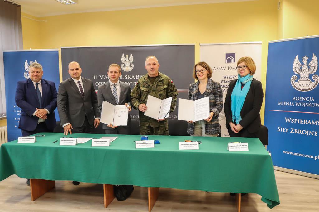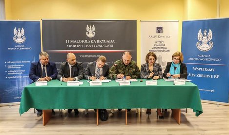 Podpisali je przedstawiciele: Agencji Mienia Wojskowego, spółki AMW TBS KWATERA i 11MBOT. Porozumienie pozwoli na wykorzystanie pod wynajem zasobu mieszkaniowego należącego do spółki AMW KWATERA przy ul. Cieślewskiego w Krakowie. Pierwsi terytorialsi będą mogli tam zamieszkać jeszcze w tym roku. Dotąd lokale mieszkalne z zasobu Agencji otrzymywali wyłącznie żołnierze służby zawodowej. Teraz pojawiła się możliwość, by w przypadku gdy potrzeby kwaterunkowe żołnierzy zawodowych są już w danym garnizonie zapewnione, a część lokali pozostaje niewykorzystana, możliwość najmu mieli również żołnierze pełniący Terytorialną Służbę Wojskową (TSW).